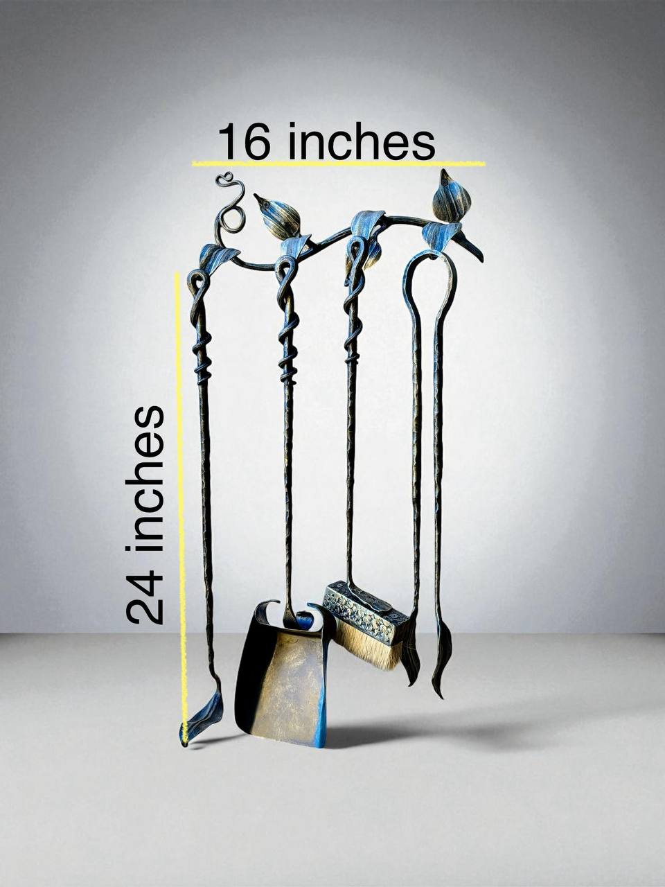 Впустите красоту природы в свой дом с этим набором инструментов для камина из кованого железа ручной работы. Подставка выполнена в форме ветки дерева, а отдельные выкованные листья служат крючками – каждый из них уникален. Сочетая в себе природную красоту, деревенское очарование и высочайшее мастерство, этот набор одновременно функционален и декоративен.