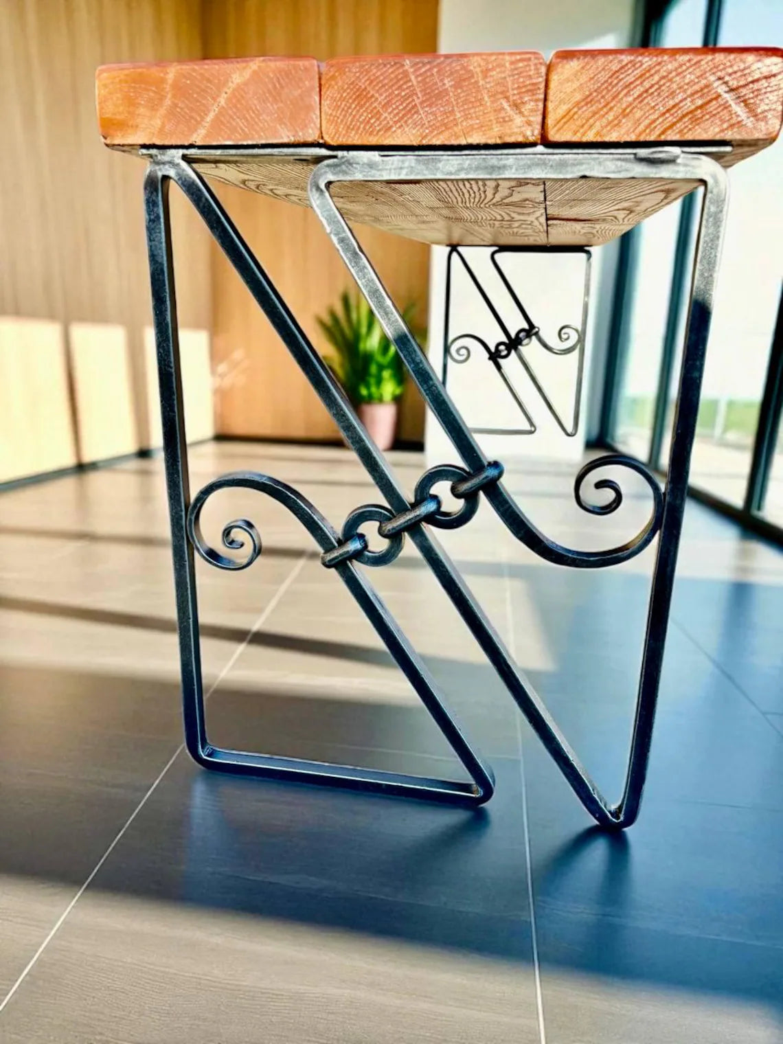 These custom hand-forged legs are crafted by a professional blacksmith from solid 12 mm square bar — not hollow tubing. The design merges vintage aesthetics with modern strength, offering an unmistakably handcrafted, sculptural look.
