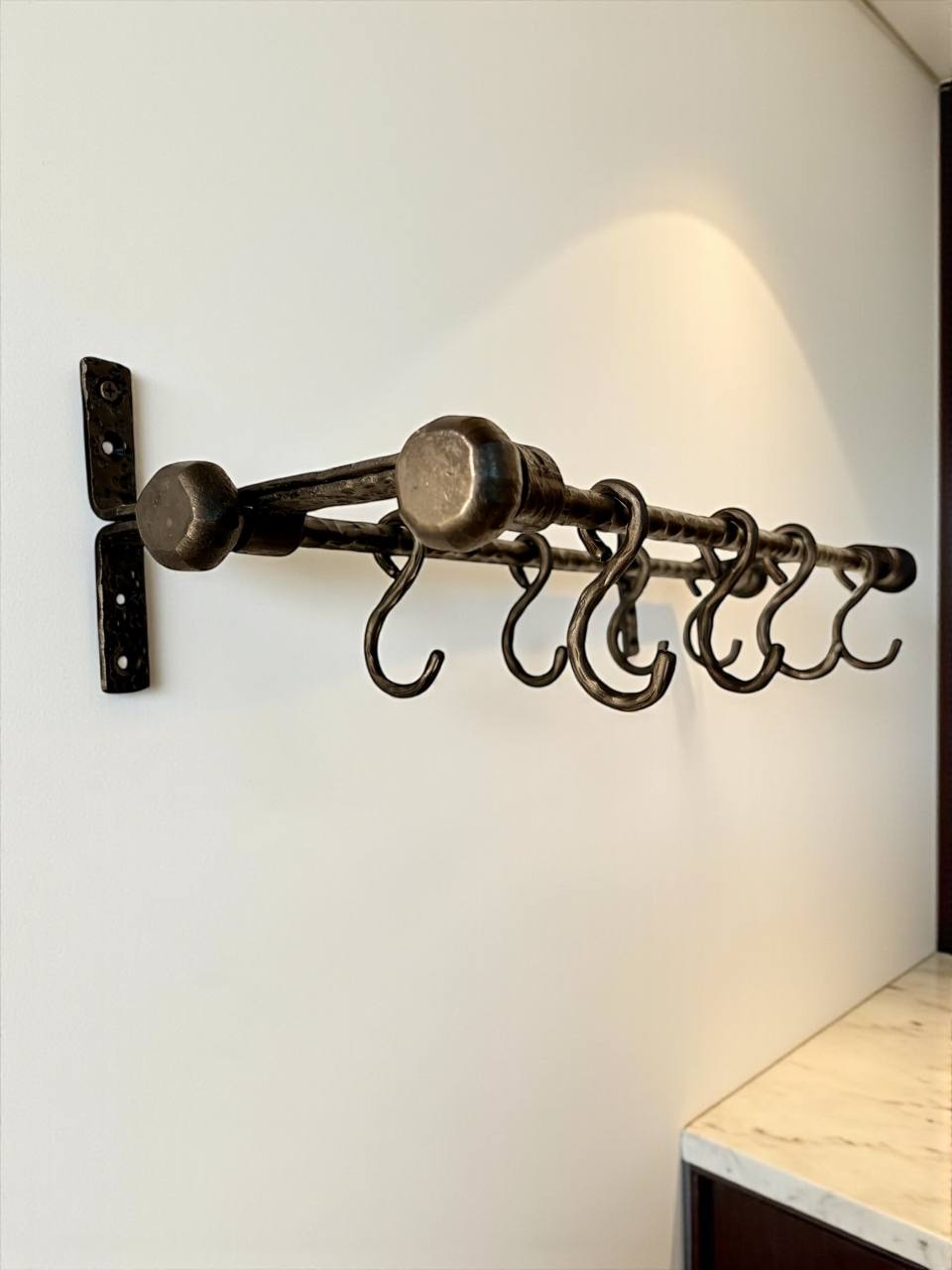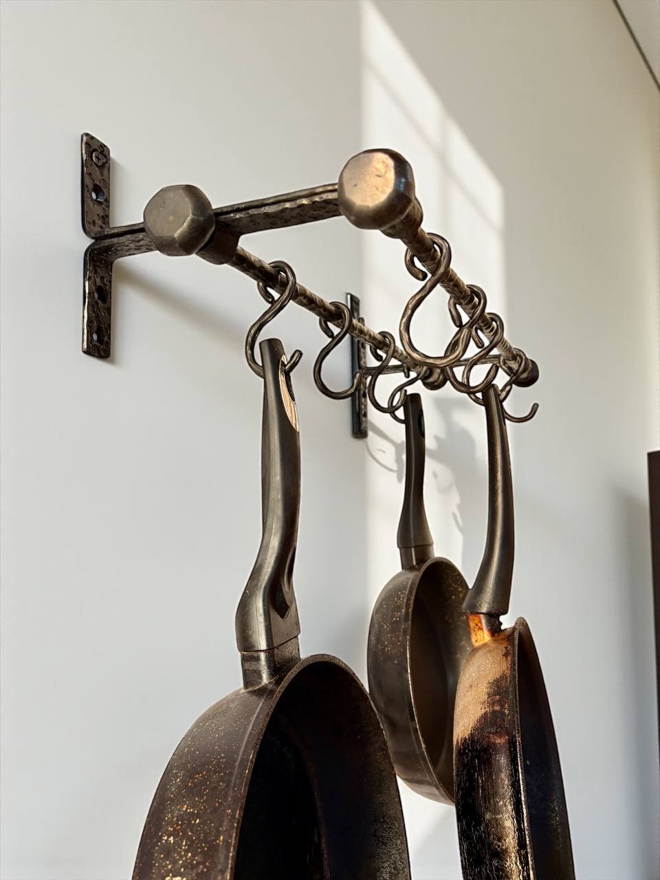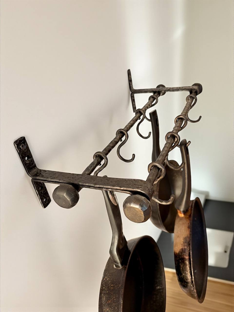 Эта кухонная полка из кованого железа ручной работы — прочное и элегантное решение для организации пространства на кухне. Изготовленная полностью вручную из прочных кованых стальных прутков диаметром 12 мм, эта конструкция с двумя перекладинами обеспечивает превосходную прочность и функциональность. Идеально подходит для подвешивания чугунных сковородок, кастрюль, кружек, тарелок или полотенец.
