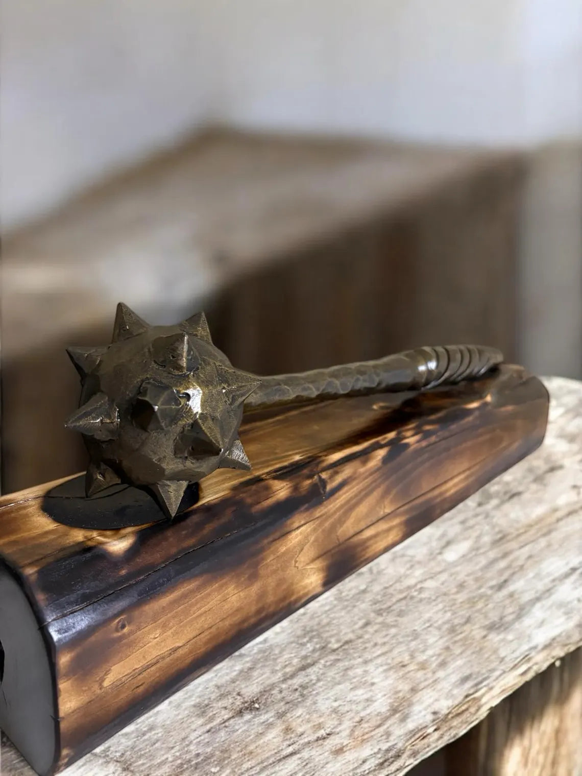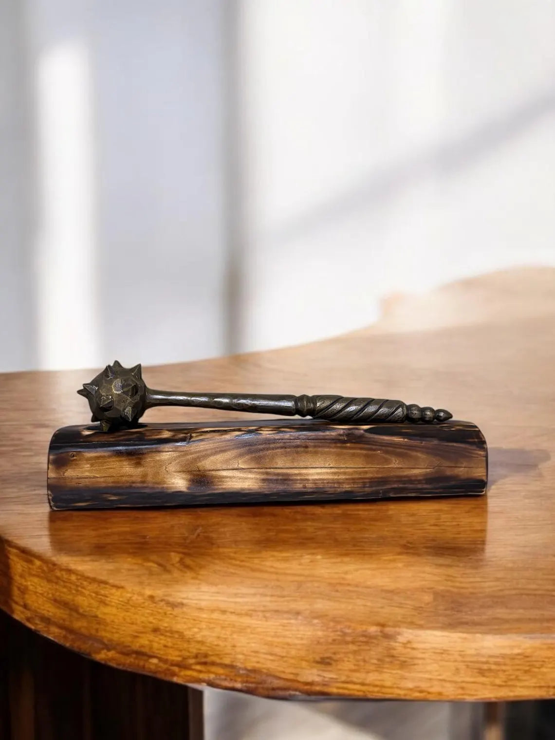 Hand-Forged Mace with Burnt Wood Stand: Medieval Warrior Decor