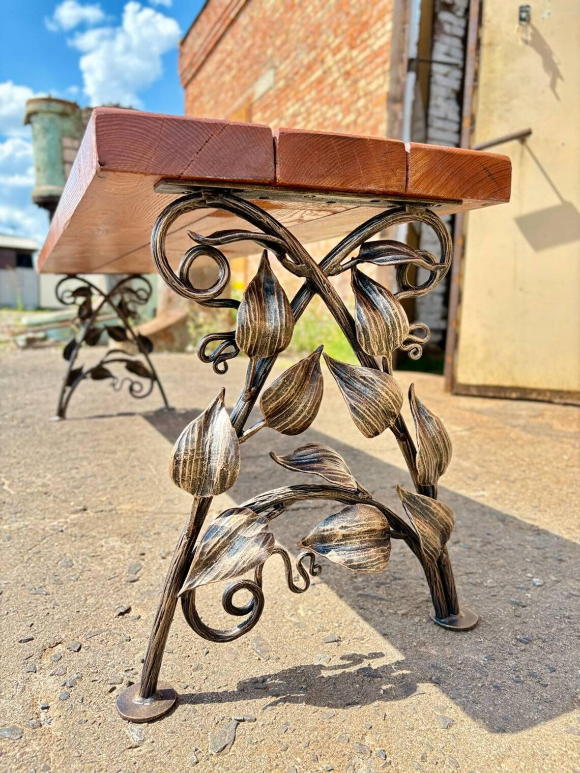 Take your space to the next level with these high quality wrought iron legs for handmade benches are a true combination of strength and artistry. Crafted with love and fire, each piece is shaped by a blacksmith in the form of vines and carved leaves, making each set completely unique.