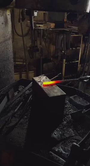 The finish is a multi-layer hot oil blackening with linseed oil, giving a deep, rich black color traditional to wrought iron,